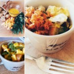 Start with small chunks of bread to cover the bottom of your coffee cup. In the middle, layer your additions. Today it’s (raw) kale and cheddar, sometimes it’s a little ham or goat cheese – whatever is handy. Add a little more bread, and your additions to get it to the top of the cup. Whisk one egg, season how you like, and pour over the top. Microwave for 1 minute, 30 seconds. Voila! For more veggie punch, I added some pickled carrot as a garnish. Enjoy!