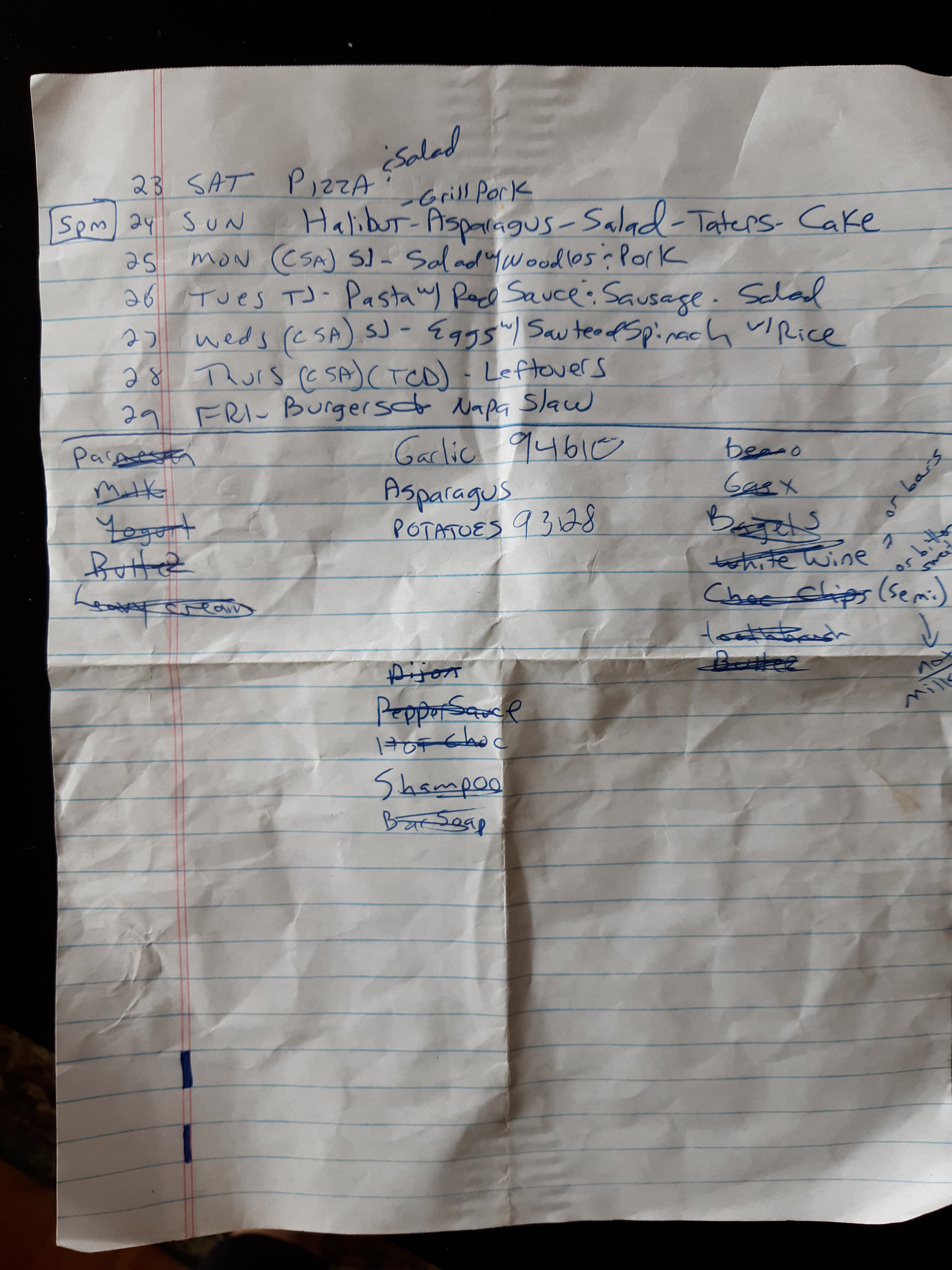 - Plan your meals. We shop about once a week – twice a month if there’s a pandemic going on 🙂 The day before shopping, using a full sheet of scratch paper, we write down the days of the week at the top, along with the dinner we’re planning, and the cookbook or location of recipe, if needed. It’s nice to see everything laid out so you can provide variety. We use starches as the variation, making sure to have rice, pasta, potatoes, etc. in a rotation, so we don’t get stuck in a rut. We also note any evening meetings/activities we might have so that we can plan for a simple meal or a leftover night. If we are planning to go out ot take out, it’s noted there as well. At the bottom of the sheet, we write down the items needed to support the plan that we don’t have on hand, along with the items that need replacing. Note: if it’s not on the list, it’s not purchased, and there’s no second trip to the store – it’s only a week, we’ll survive. After shopping is done, the list goes on the fridge, so we always know what’s for dinner.