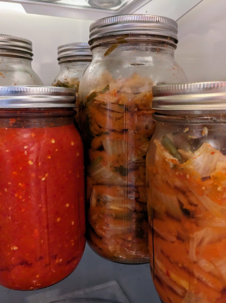 Cabbage is in your box this week, perfect for kraut and the best recipe for newbies to start with. Hot pepper sauce is also easy to make and will last for months in the fridge. That one calls for an airlock lid, but using a weight (read the kraut recipe first) to submerge the peppers under the brine will work just fine. More complex is kimchi, but well worth the effort!